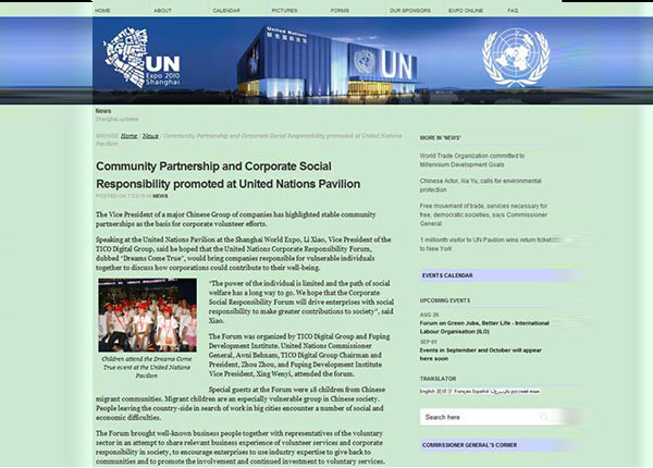 在2010年7月23日的上海世博會聯(lián)合國館官網(wǎng)出現(xiàn)了天創(chuàng)數(shù)碼集團的身影,以“Community Partnership and Corporate Social Responsibility promoted at United Nation...